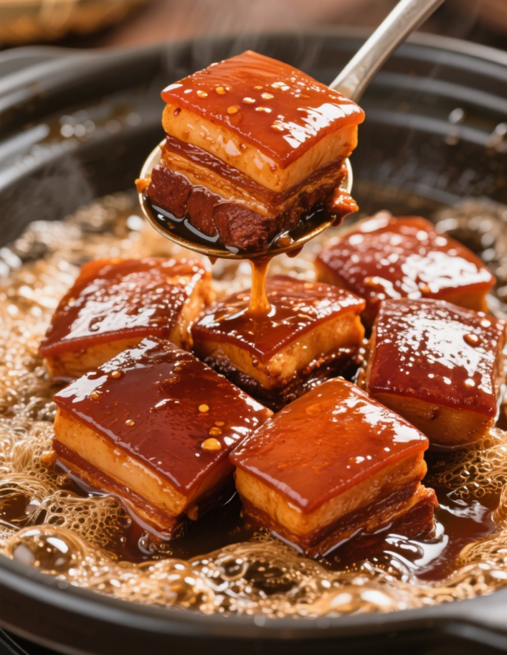 杭州时期则是是东坡肉的定型阶段。江南地区调味料更加丰富,当地人开始在苏东坡的基础上加入酱油、绍酒、冰糖等调料,形成了现在“酒肉同烹、咸甜适中”的独特风味。特别是绍兴黄酒的加入,让东坡肉产生了质的飞跃——酒香去除了肉腥,同时使肉质更加酥烂。